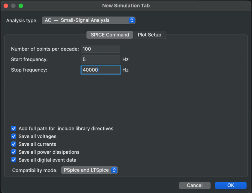 we’ll select AC analysis. With just these settings, you can already see the response clearly.