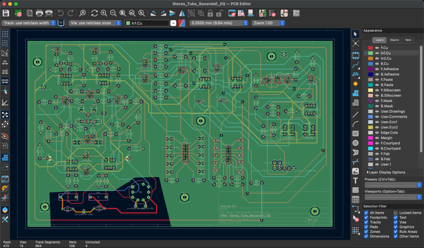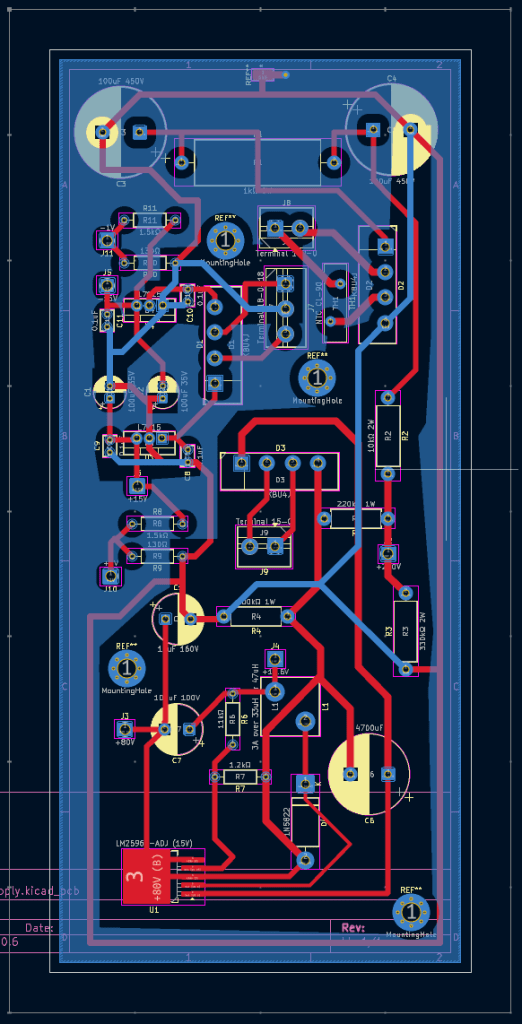 Once the schematic design is complete, the next step is translating it into a PCB layout. At its most basic, a PCB consists of two layers: the first layer carries the signal traces, and the second layer serves as ground. However, in audio equipment with a high component count, two layers may not be sufficient. In my case, I had to distribute multiple DC voltage rails throughout the circuit, and several chips had many pins that required careful routing. As a result, I designed the main board as a four-layer PCB, while the power supply board remained a two-layer design.