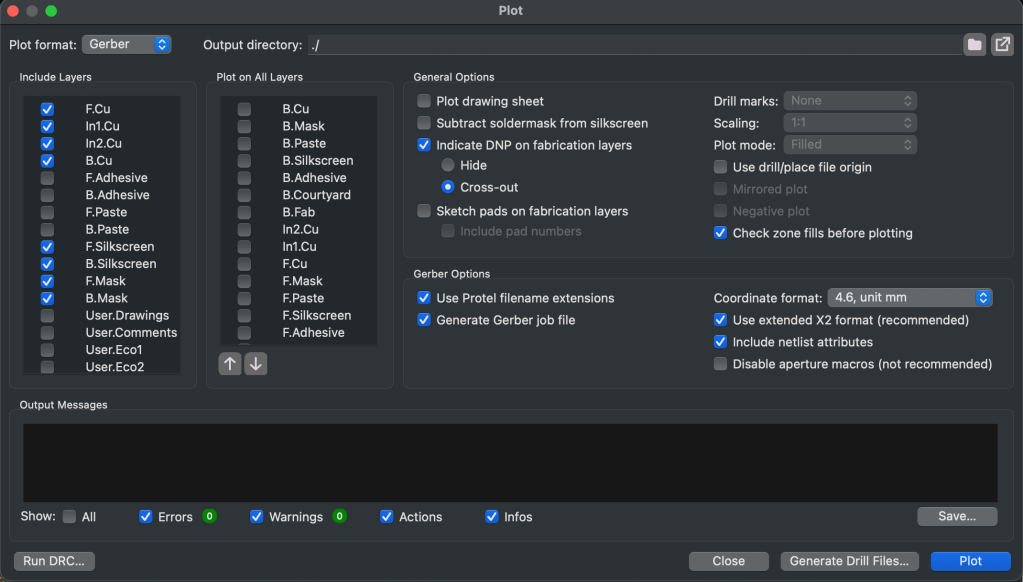 After that, you define the board outline using the Edge.Cuts layer. Then you go to File → Plot, select all the required layers, and generate the fabrication files. Since the plotted files don’t include drill data, you also need to export a separate drill file.