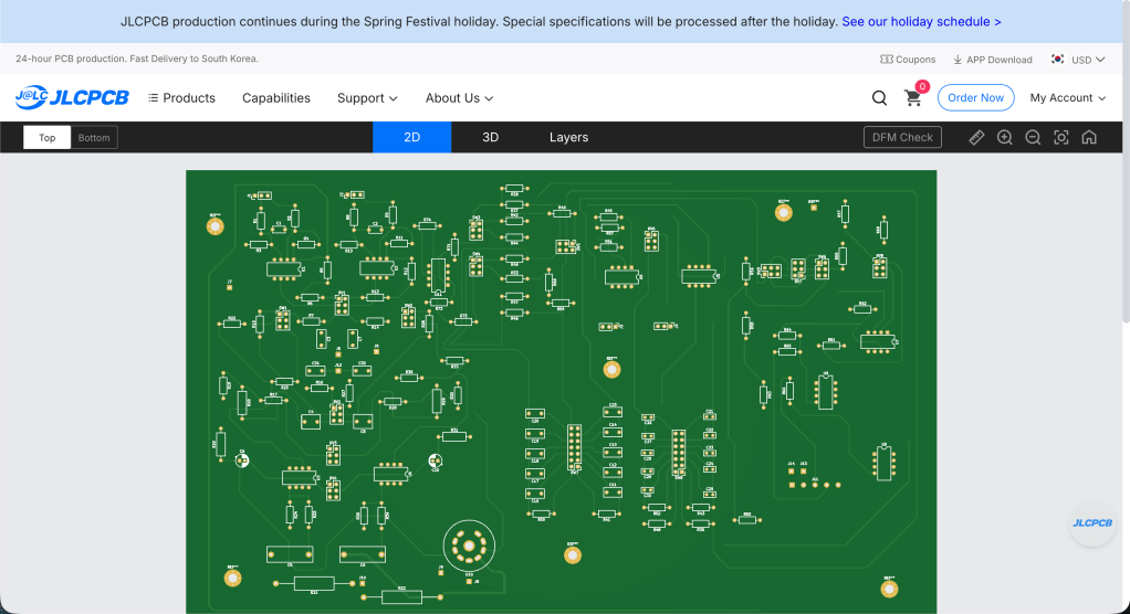 I ordered my PCBs from JLCPCB. After compressing all the generated files into a single ZIP archive and uploading it, you can preview the board before placing the order. There’s also a DFM (Design for Manufacturability) check that identifies potential production issues or design mistakes. It seems the manufacturer performs an additional review after you place the order as well.