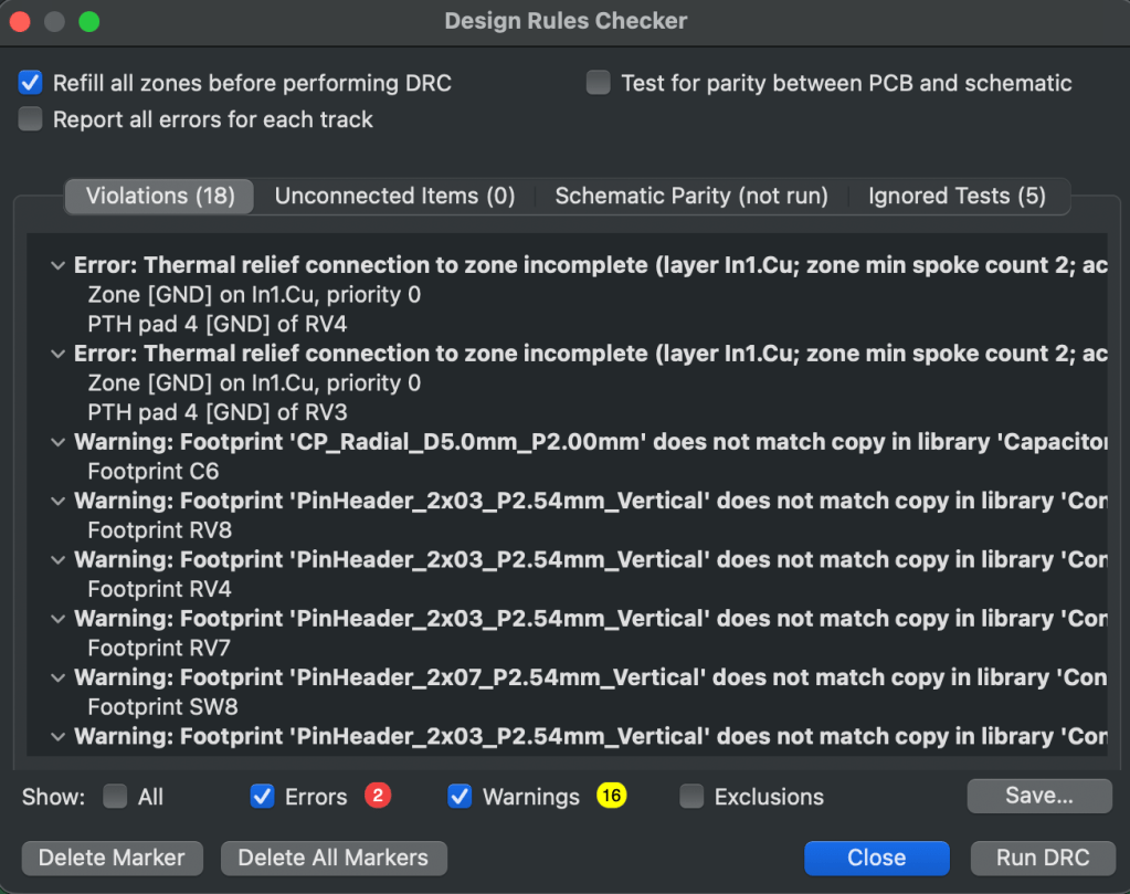 Once the layout is complete, you run a final design rule check. You’ll see a list of errors and warnings. If certain warnings are triggered by intentional design decisions, you can ignore them—but everything else should be reviewed carefully. In my case, I found a few unconnected traces that I had missed.