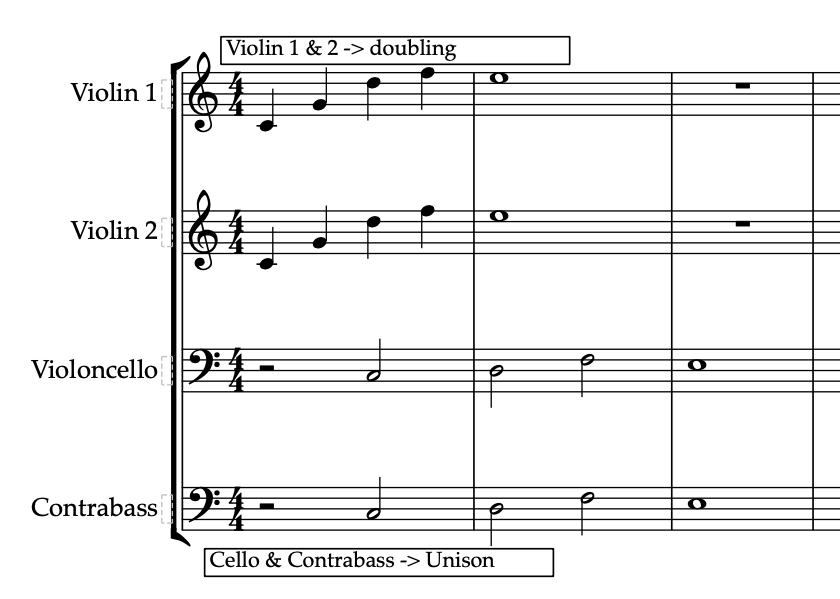 Violoncello and Contrabass often form a doubling relationship, and in many cases, doubling is done by placing an additional high string on top of Violin 1. When playing loudly and strongly, Violin 1 and Violin 2 sometimes unify.