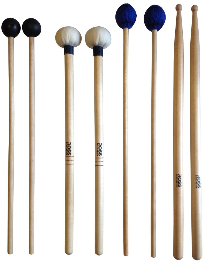 A mallet consists of a stick and a head. Generally, the stick is made of rattan, while the head can be made of various materials, resulting in different timbres. Performers typically prepare several mallets to choose from, depending on the desired nuance, ranging from hard, medium, soft, wire brushes, timpani/bass drum mallets, to drumsticks.