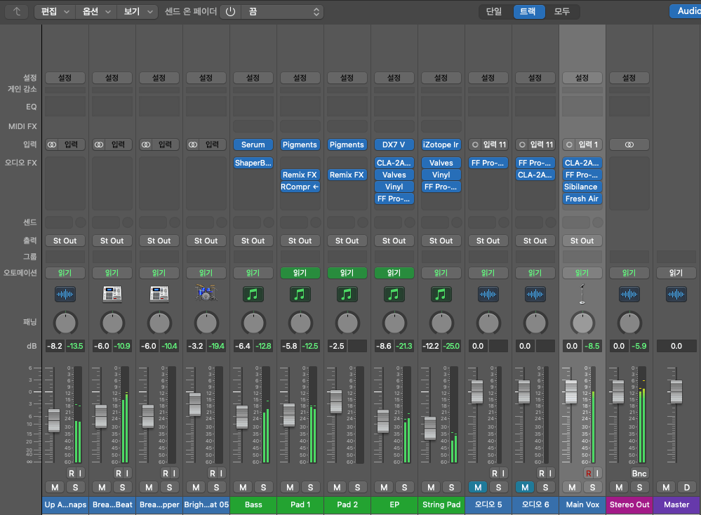 I usually prefer Cubase for mixing, but the current project is in Logic, so I brought the Logic mixer window. Here, you can see that each channel strip is quite similar to an analog mixer.