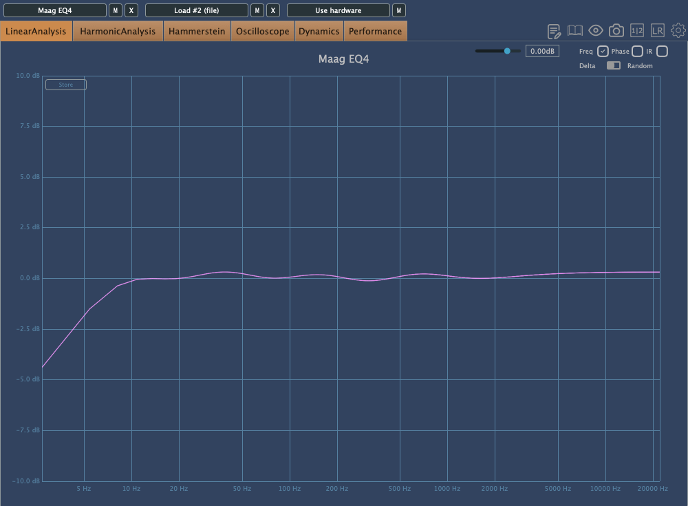 On the left is the frequency response graph when only the Maag EQ4 plugin is applied without any adjustments, and on the right is the phase change graph under the same conditions.