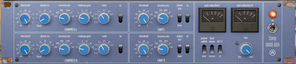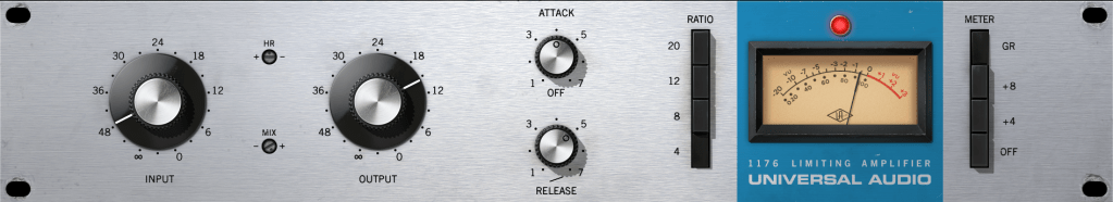 The UA 1176 is a prime example and remains one of the most famous Solid State compressors. It is known for its very fast attack and release times. The Blue Stripe version of the 1176 is especially noted for its strong coloration, making it a favorite for drum sources.