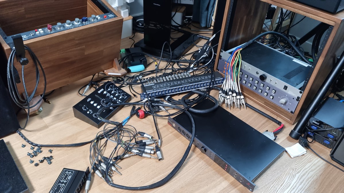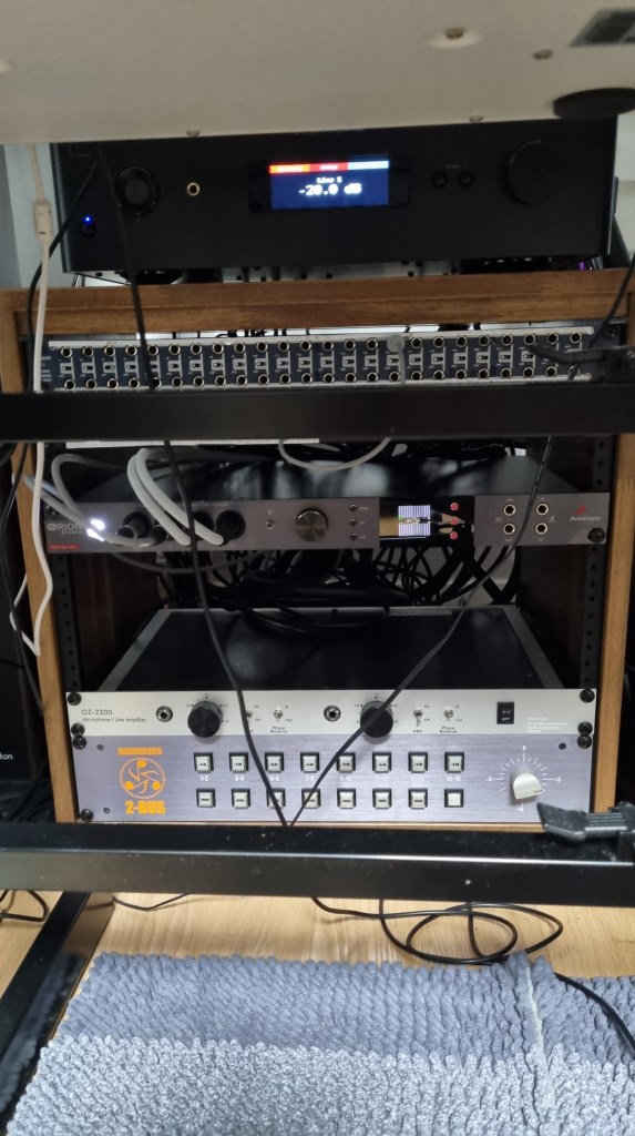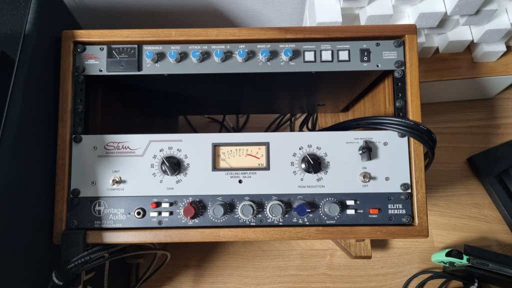 I plan to add a 2U tube preamp to the large rack cabinet, and a Behringer 369 to the smaller one. That will leave about 1U of space, which I might use for an API 2500 or a saturator later on.