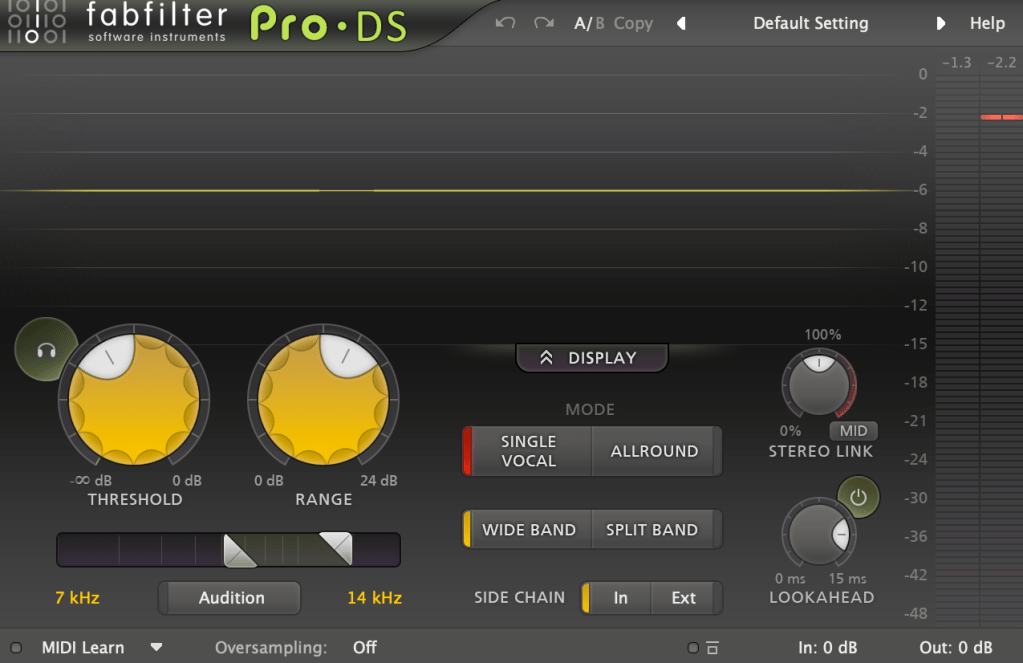 Sibilance typically falls between 3kHz and 10kHz. A De-Esser works by activating the compressor when the sound in this specific range exceeds a certain threshold. Unlike using an EQ, which reduces the selected frequency range across the entire source, a De-Esser targets only the problem area. You can think of it as a single-band compressor.