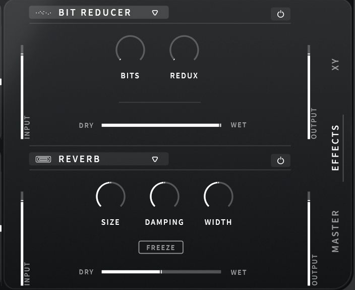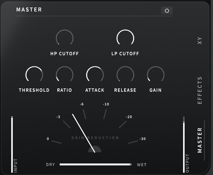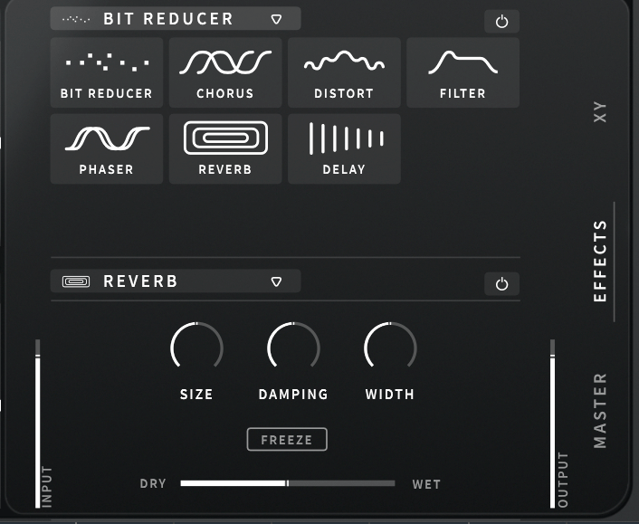 At the bottom center, you can choose between the XY, Effects, and Master sections to adjust various parameters.
