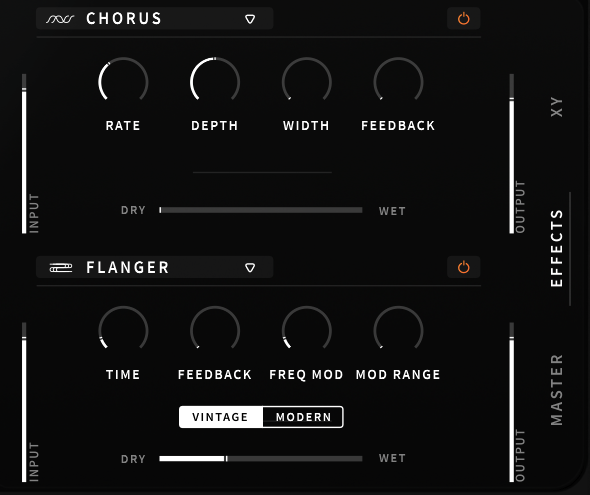 Opening the settings panel, you’ll find two Macros on the right and two LFOs labeled as MOD, allowing modulation of parameters with four values.