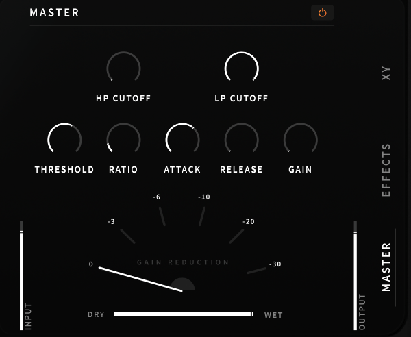 In the lower right section, you can adjust Macros with the mouse, apply the overall effect, or tweak EQ/Compression in the master section.