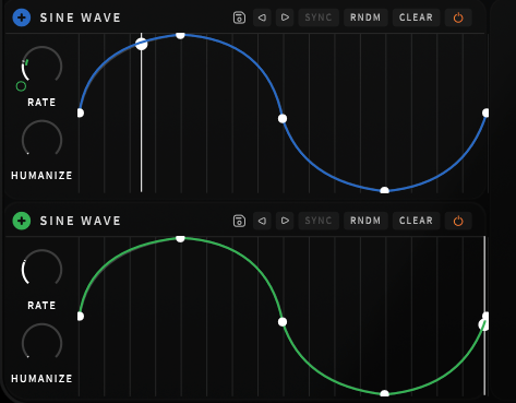 The Modulation section works like a synthesizer’s LFO. Clicking the + button and assigning it to a parameter creates a small circle that you can adjust up and down to control the amount of modulation.