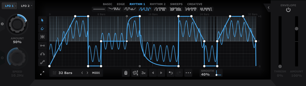 Using both LFO 1 and LFO 2 (located at the top left), you can modulate LFO values like this. The thin blue line in the background represents the LFO that will modulate the parameter.