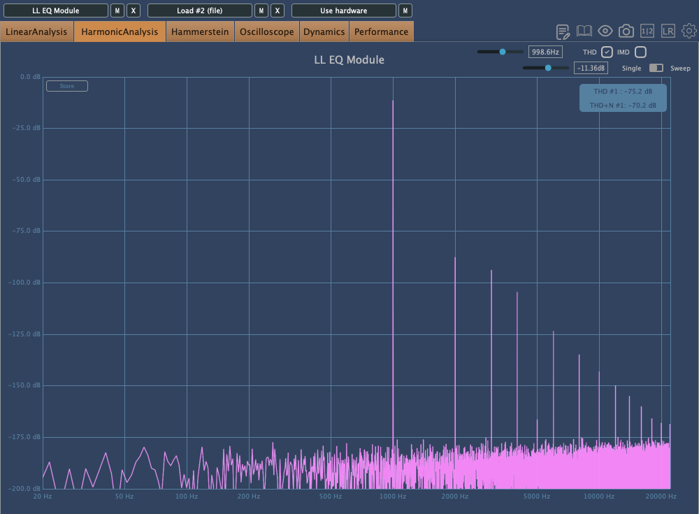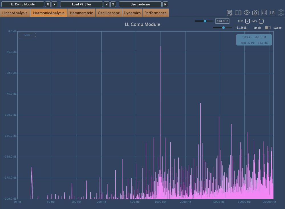 The photo above shows the frequency response graph when Clean is set to 100%. There’s no visible harmonic distortion in Clean mode, so I’ve skipped that image.
