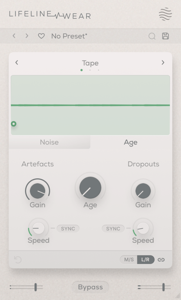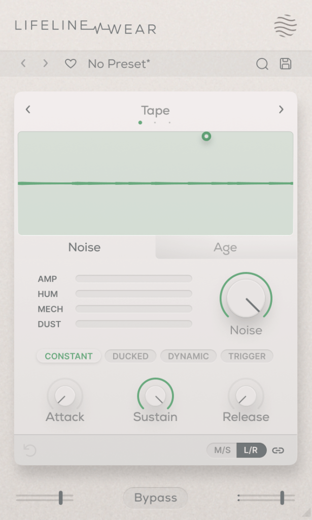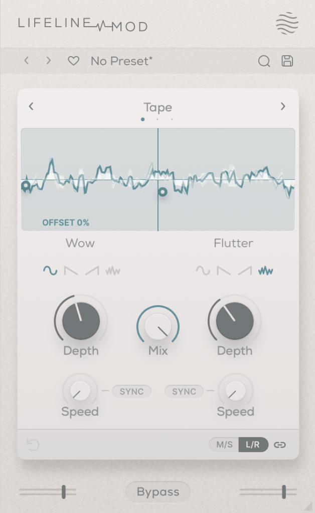The Mod module simulates Wow/Flutter noise with three options: Tape, Vinyl, and Cassette.