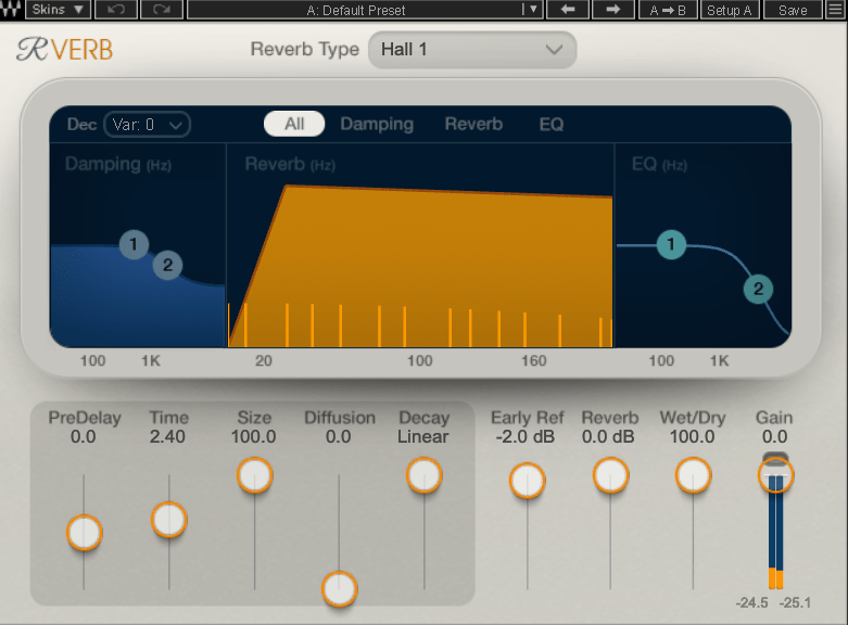 Here’s RVerb, a basic digital reverb plugin from Waves.