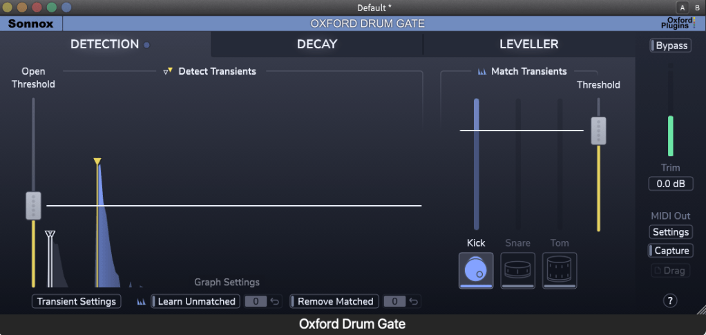 Sonnox Drum Gate is a gate plugin specifically designed for drums. On the left side, you can set the threshold like a typical gate using the Open Threshold. For kicks, snares, and toms, the Match Transients feature on the right allows for more precise separation.