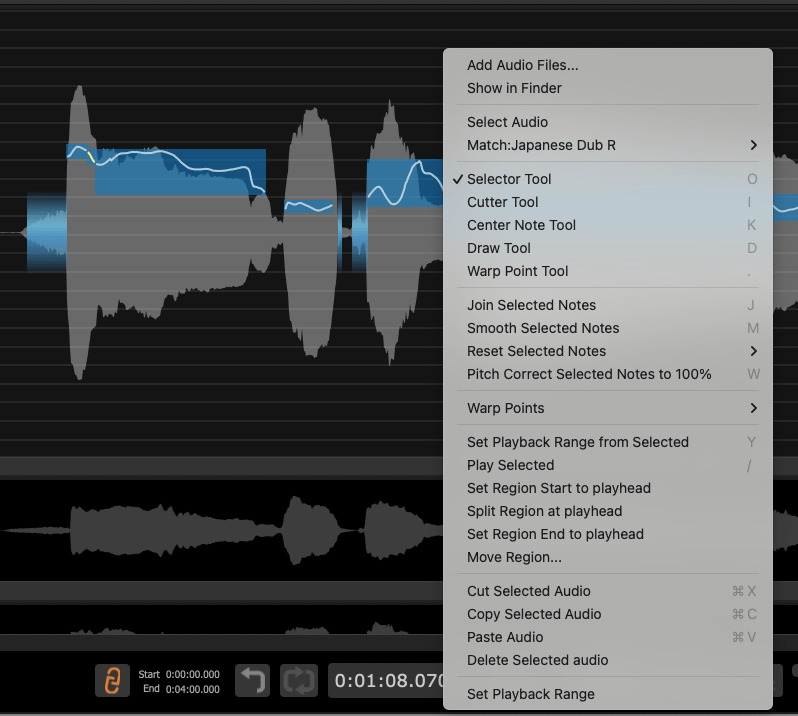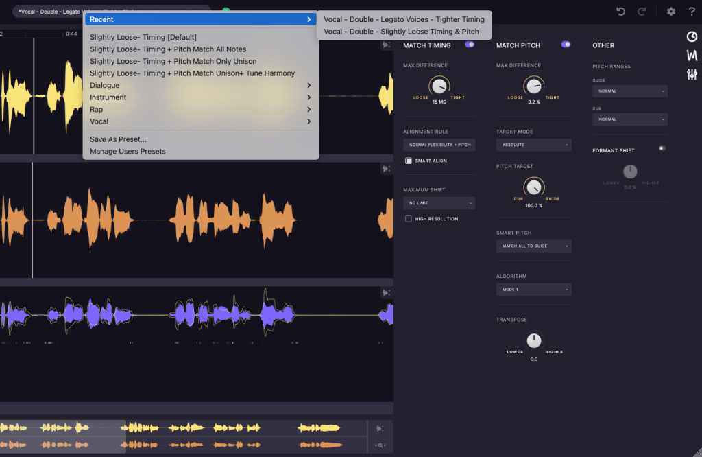 After importing audio files, you can right-click to choose whether to generate doubles, adjust pitch, timing, or level.