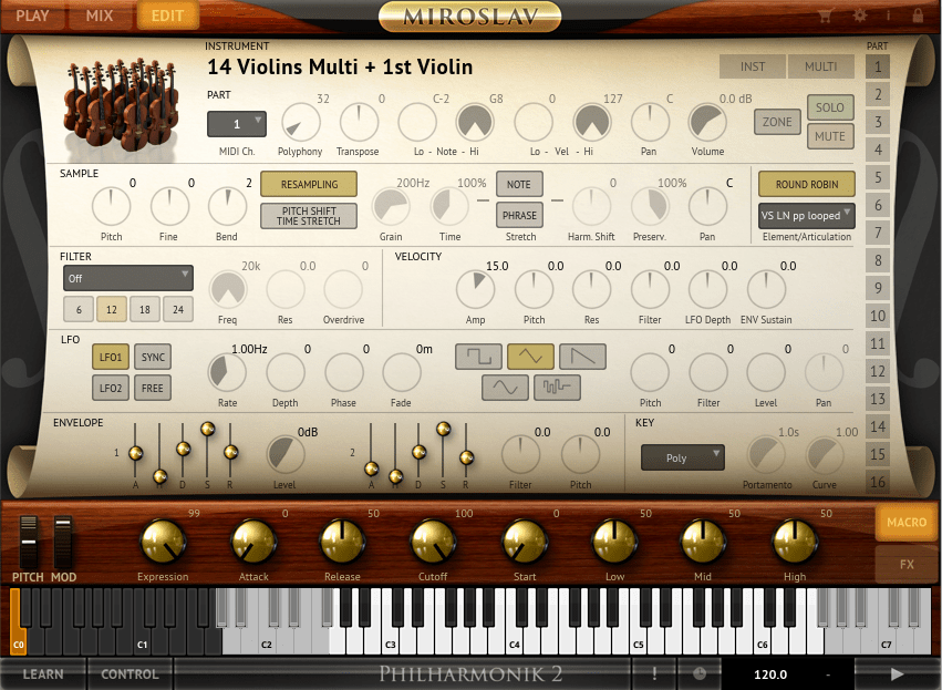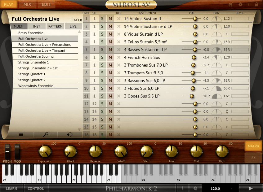 Miroslav Philharmonik 2 is IK Multimedia’s orchestral virtual instrument. At first listen, its sound might strike you as overly classical and dated. However, by tweaking the Filter setting in the Edit window (turning it Off), you can bring back a brighter, more balanced tone.