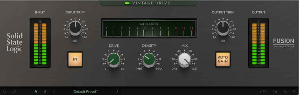 The Vintage Drive plugin adds saturation and harmonic distortion while increasing low-end warmth.