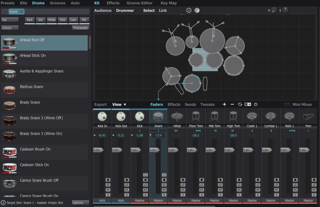 • Select any drum instrument by clicking on it, and swap it out from the available options.