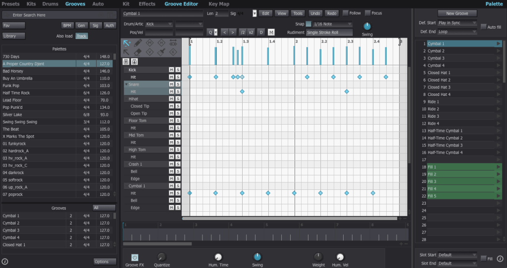 The Groove Editor lets you view, modify, or drag MIDI grooves into your DAW.