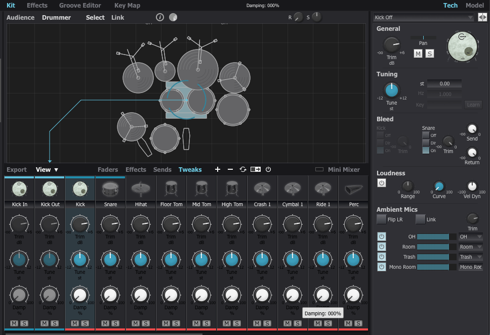 The Tweaks, Tech, and Model sections are critical for fine-tuning drum tones.