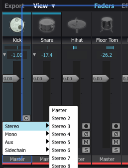 To route individual instruments to separate outputs, assign them to specific channels in the mixer.