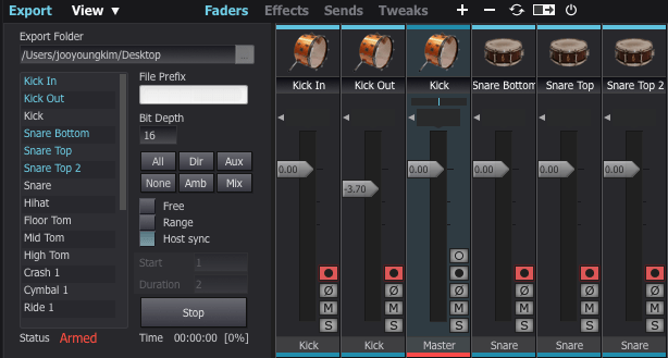 Next, enable the record buttons for the desired tracks in the mixer window. Then, click Export on the bottom left, choose your preferred bit depth, enable Host Sync, and hit the record button to start exporting.