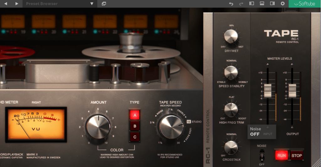 Softube’s Tape plugin is very clean tape machine plugin. The harmonic distortion quantity could changeable by Amount parameter, and tape type could be selected by the Type parameter. (Type A is clean side, B has quit a lot of low frequencies, C has the characteristic between A and B)