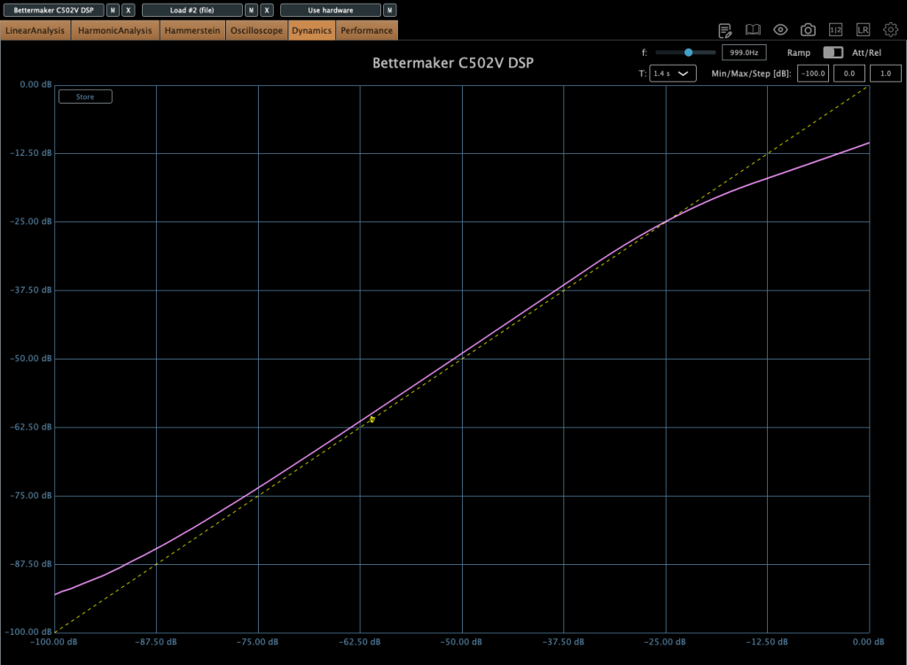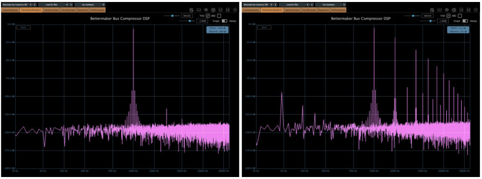 First is BM mode, second is SG, and third is DX. The differences in harmonic distortion and compression curves explain why this plugin sounds distinct from the Bus Compressor DSP. The C502V has a steeper knee, and it varies by mode.