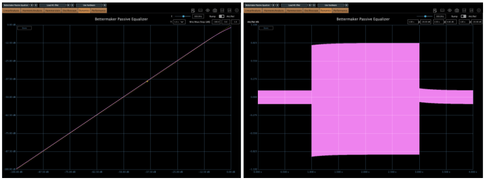 On the left, I activated just the P EQ section and tweaked it a bit. The curve is as complex as you’d expect from a Pultec-style EQ. Harmonic distortion is pristine, and there’s no compression curve to speak of—it’s just an EQ, plain and simple.