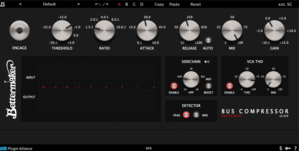 The Bettermaker Bus Compressor is a plugin recreation of Bettermaker’s hardware Bus Compressor. The original hardware allows digital recall and adjustments, and the plugin’s interface mirrors that design pretty closely.