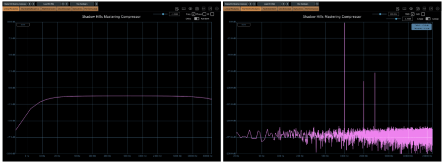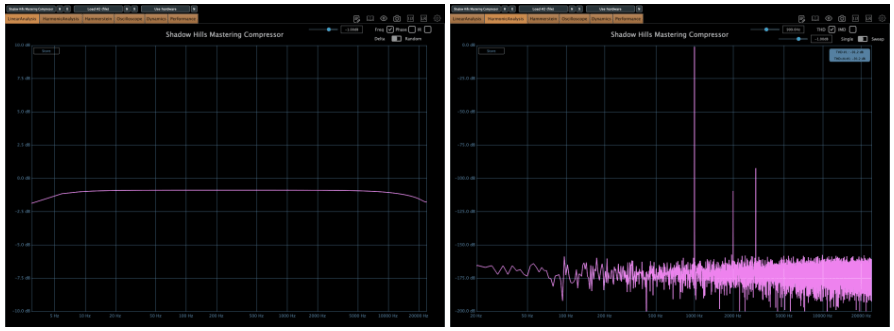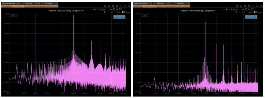The Opto side adds some harmonic distortion, while the Discrete side is cleaner—both in Plugin Doctor measurements and by ear.