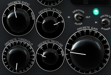 The Discrete section is a VCA compressor with a bunch of tweakable parameters. They’re pretty straightforward once you look at them. For example, in the Ratio settings, “FLOOD” is around 20:1, and in Recovery, “Dual” means it follows a two-stage release like the Opto mode.