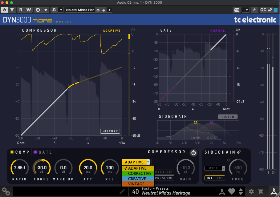These have friendlier UIs and feel more approachable. DYN 3000, based on Midas Heritage consoles, is a super-clean digital compressor—Adaptive mode keeps it pristine, while other settings add character. It’s got a gate, sidechain, and all the essentials.