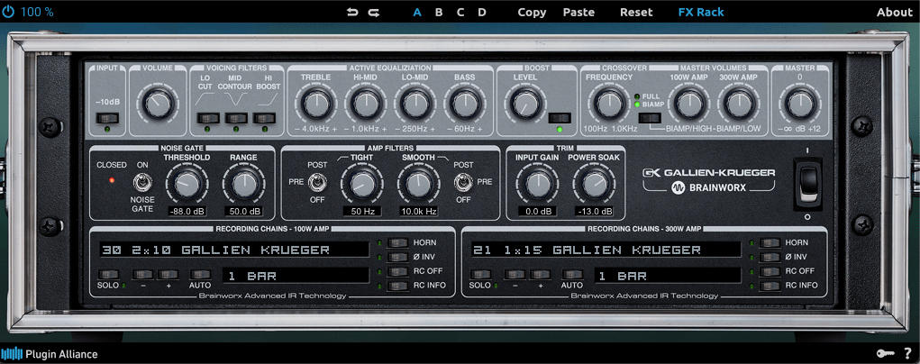 In the plugin, you’ll see it split into 300W (lows) and 100W (highs). You can choose the Crossover Frequency to determine how frequencies are divided or use it in Full Range mode without bi-amping.