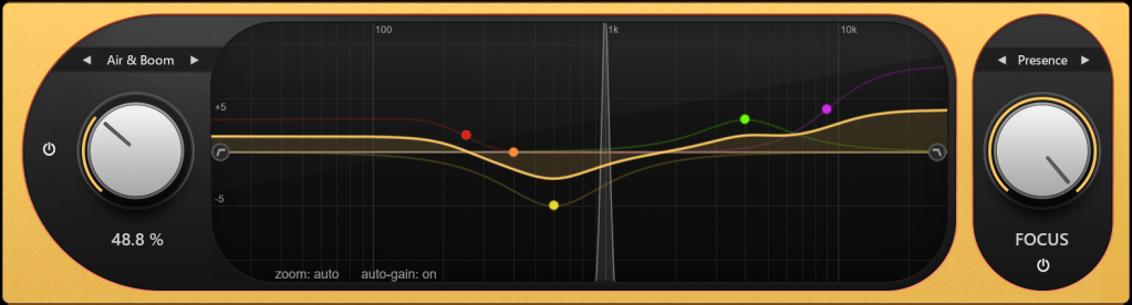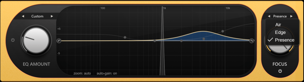On the left, you’ve got controls for how much EQ to apply. On the right, the Focus section offers three dynamic EQ presets: Air, Edge, and Presence.