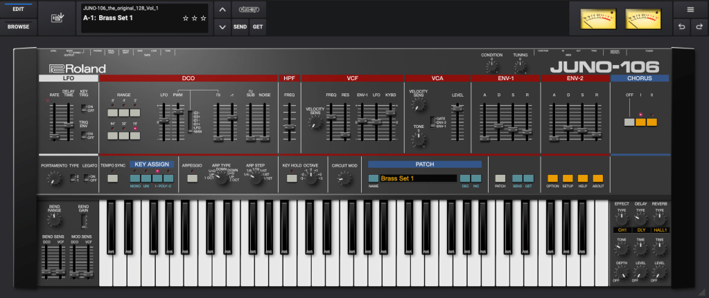 The standout feature? That lush Chorus effect on the right side of the interface. Back in the day, synths like the JUNO-106 used chorus to create a stereo sound, giving it that iconic ‘80s vibe. Comparing the plugin’s presets to YouTube recordings of the original hardware, the emulation is spot-on, though the high frequencies are slightly sharper in the plugin. A touch of EQ can get it sounding nearly identical to the hardware’s smoother tone. Roland nailed the recreation here.