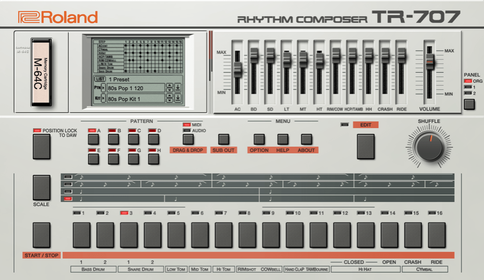 The TR-727, a sibling of the TR-707, specializes in Latin percussion sounds—think tropical rhythms for afrobeats, reggaeton, or Arabic pop. It shares the same UI as the 707, making them easy to sync for house music production.