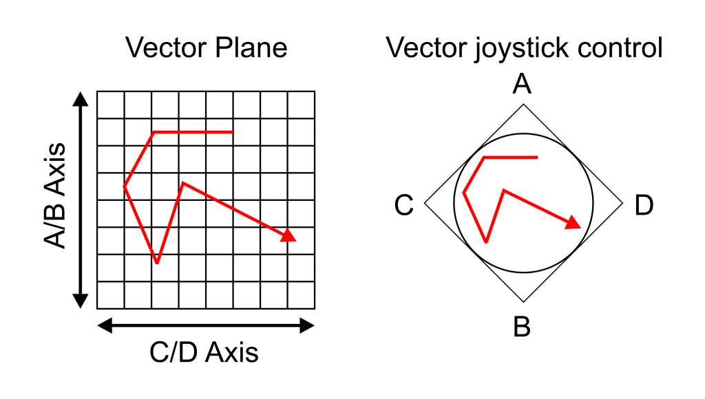 This method assigns different sound timbres to the four corners of a square. Using a joystick, you can intuitively blend these sounds together! The resulting sound, created by mixing these four sources, can be represented as a single point on a coordinate plane using vectors—hence the name “vector synthesis.”