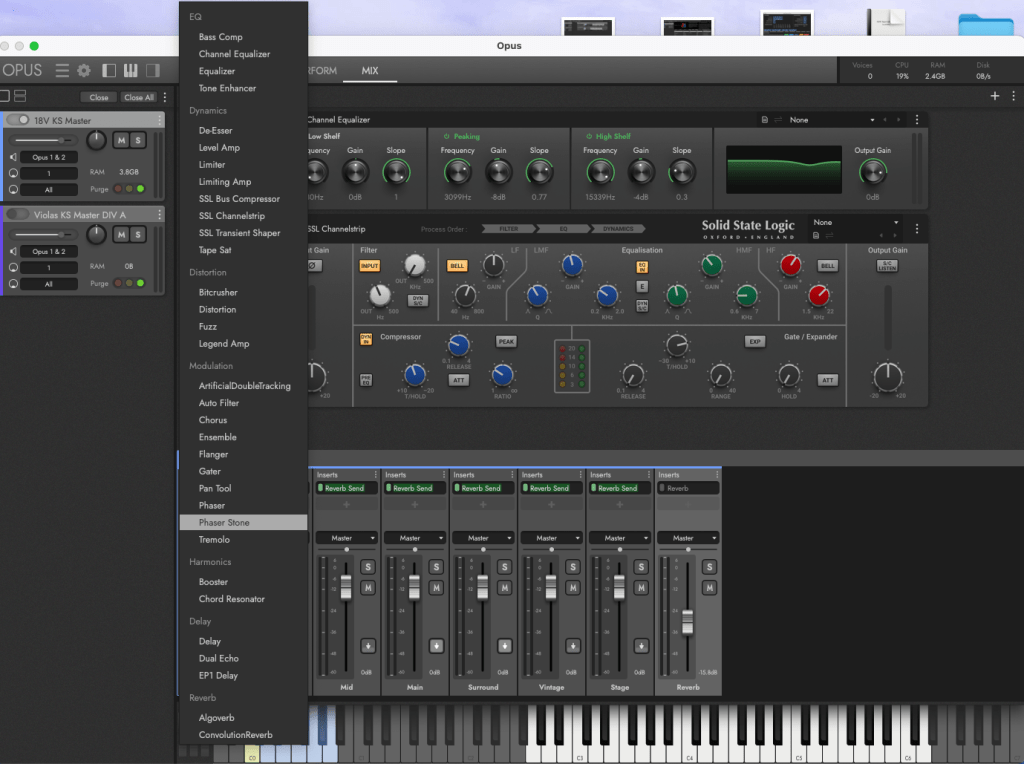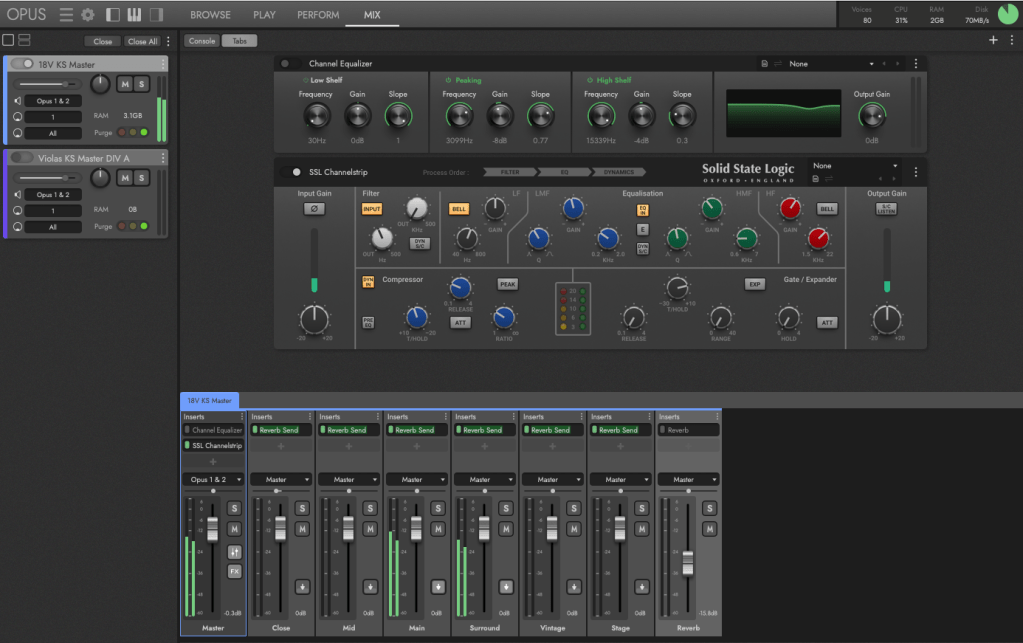 The Mixer view is also impressive. It features an officially licensed SSL (Solid State Logic) Channel Strip, Transient Shaper, and Bus Compressor. Having these high-end tools directly integrated into the engine is a huge advantage for shaping your orchestral sounds.