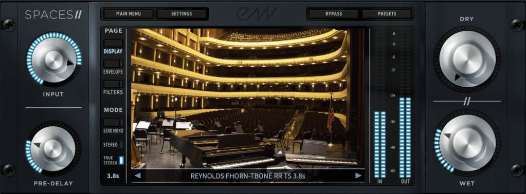 Spaces II features over 1,020 presets, including 353 new snapshots. What sets it apart is the True Stereo (S-S) processing. Unlike standard reverbs that sum the input to mono, True Stereo preserves the actual stereo imaging of your instruments, providing an incredibly realistic and wide orchestral stage.
