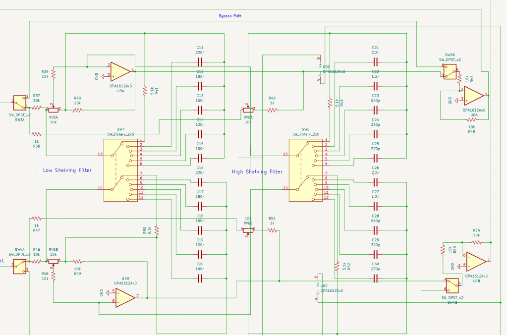 The EQ design is straightforward, consisting of two sections: Low and High. While the gain is continuously adjustable, I made the frequency switchable using rotary switches, allowing for precise and repeatable settings.