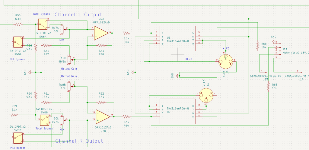 The input stage was simple enough, but the output stage was a total ambush. I wanted to include a Mix knob, a Mix Bypass switch, a Total Bypass switch, and an Output Gain knob. Trying to integrate all these features into the signal path turned into a bit of a mess!